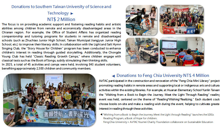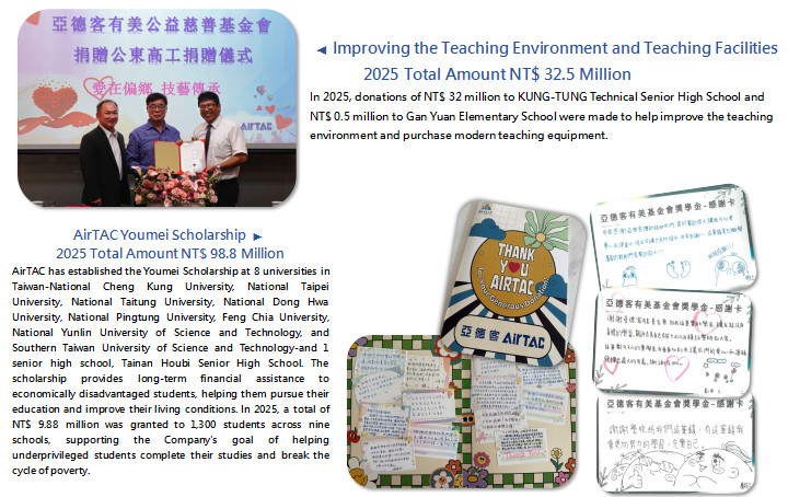 The AirTAC Youmei Foundation has long been dedicated to supporting education in rural areas and assisting economically disadvantaged students. The Foundation aims to encourage young students from low-income families to persevere through adversity and seize the opportunity to change their lives through knowledge. Guided by this mission, the "Blue Student Aid Project" was launched to establish the AirTAC Youmei Scholarship in partner universities and high schools, enabling underprivileged students to pursue their education with stability and confidence, and to create a better future for themselves.