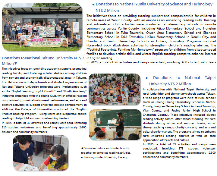 We recognize that literacy is the foundation for lifelong learning. Children from remote areas and disadvantaged families often lack sufficient home resources and cultural stimulation. To cultivate reading habits and artistic appreciation among these children and help bridge the urban–rural gap, we have collaborated with universities to implement a variety of initiatives. These include guided reading programs, mobile reading tours, story theater performances, book clubs, winter and summer camps, reading and writing workshops, library exploration camps, mobile book vans, and tutoring camps, among other literacy- and arts-related activities. Through these programs, we aim to bring reading to remote and island communities, and by fostering mentorship-older students guiding younger ones-provide children with more opportunities to engage with cultural and artistic education. Our goal is to broaden their horizons, nurture a love for reading, and develop their artistic abilities, ultimately opening up diverse possibilities and future opportunities for children in remote and disadvantaged areas.