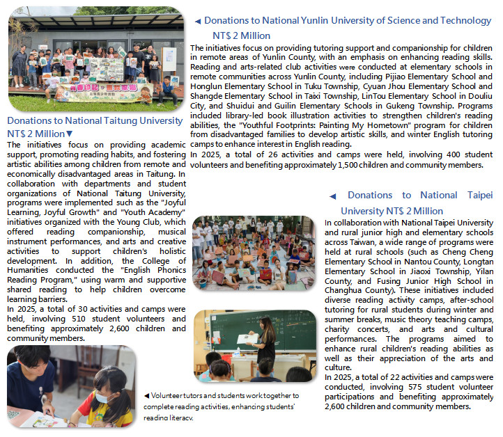 Collaborating with universities to promote reading and cultural activities for children in remote areas Total donations of NT$ 12 million in 2025