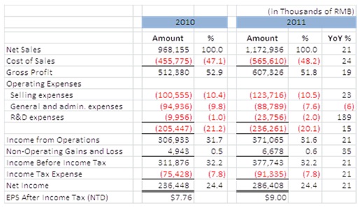 After audited by CPA, consolidated revenue in 2011 was RMB1,172,936 thousand dollars, RMB204,781 (21%) increased compared to the same period last year. Net income was RMB286,408 thousand dollars, a 21% increased compared to the same period last year. EPS after income tax was NTD9.00.